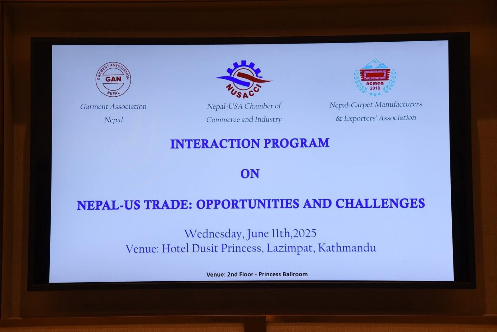 A high-level discussion program titled "Nepal-US Trade: Opportunities and Challenges" was held in Kathmandu on June 11, 2025, to assess the impacts of the recently introduced U.S. Reciprocal Tariff policy and chart a strategy for safeguarding Nepal’s trade interests. The event was jointly organized by the Garment Association Nepal (GAN), Nepal-USA Chamber of Commerce and Industry (NUSACCI), and Nepal Carpet Manufacturers’ and Exporters’ Association (NCMEA).